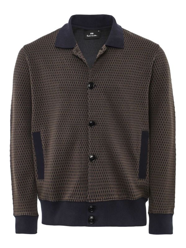 The jacquard diamond pattern gives it a bold, textured look, balanced by a classic collar and button-through front. Welt pockets add practicality, while contrast ribbed trims finish it with a sharp edge—making this Paul Smith cardigan a versatile piece for smart-casual styling.