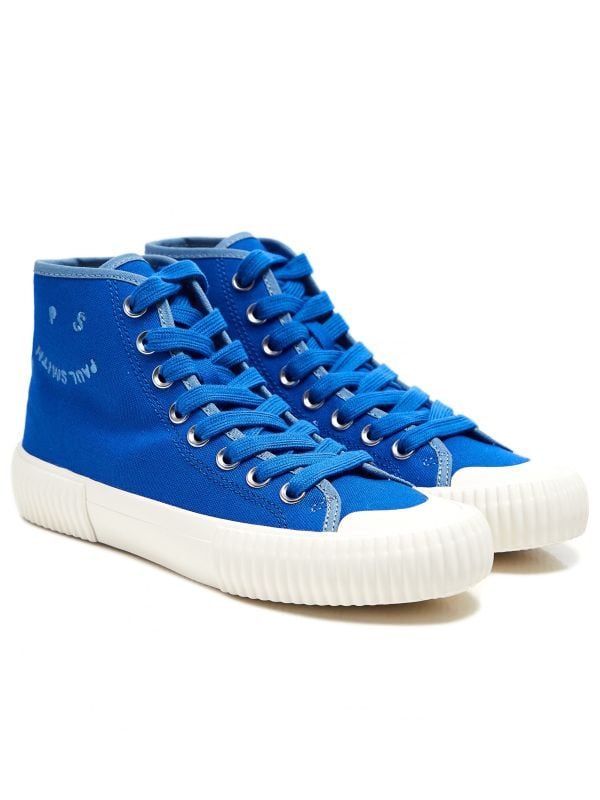 Expertly crafted with 100% canvas uppers, the PS by Paul Smith Kibby sneakers are a must for your off-duty wardrobe. These stylish high-top sneakers feature a chunky rubber midsole, rubber toe cap and contrast trim, with embroidered 'PS Happy' detailing on each side for a fun finishing touch. Wear with your favourite t-shirt and jeans to complete your casual look.