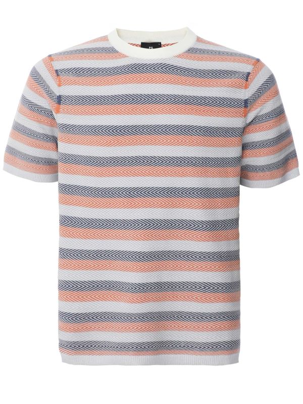 The Paul Smith knitted striped t-shirt is a fresh take on a classic casual essential. Made from knitted organic cotton, it’s soft, breathable, and perfect for staying comfortable in warmer weather. The crew neck and short sleeves keep it laid-back and easy to wear, while the striped herringbone pattern adds an interesting, textured detail that elevates the design.
