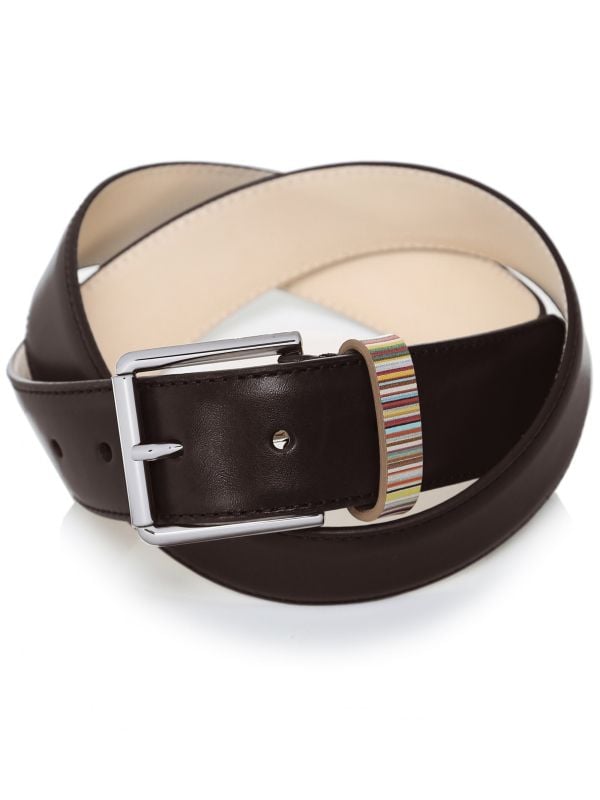 Add a touch of luxury to your accessories with the Paul Smith Signature Stripe keeper belt. Expertly crafted in Spain from a smooth calf leather, the belt features a zamac and pewter metal buckle, whilst being complete with the label's 'Signature Stripe' pattern to the keeper for an iconic finish.