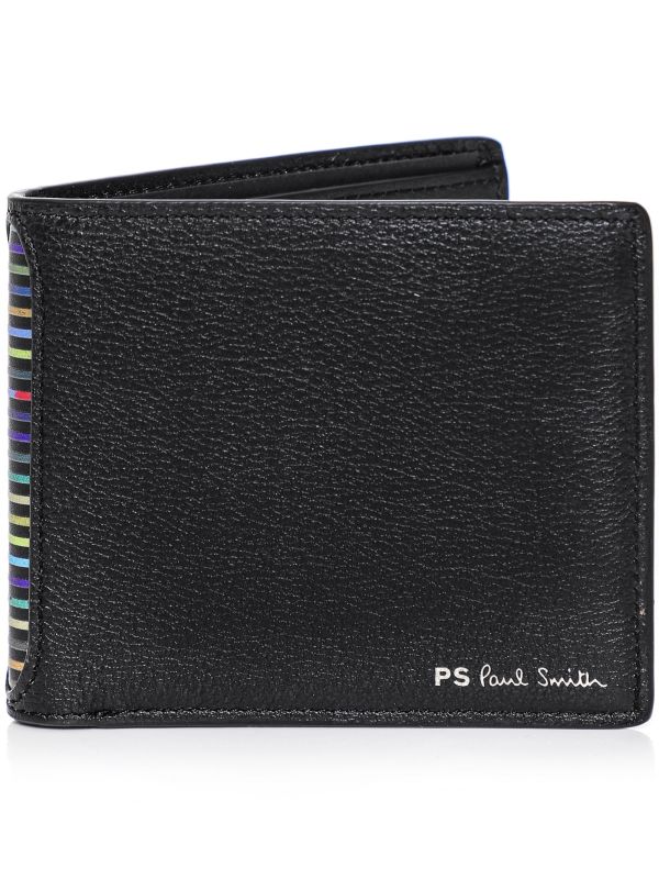 Upgrade your essential accessories with the PS by Paul Smith stripe insert wallet. Crafted in premium calf leather with a grained finish, the black wallet is adorned with a striped insert to the exterior fold for a bold pop of colour. Featuring six card slots, two slip pockets and a main note compartment - there is ample space to store all of your credit cards, receipts and cash. The Paul Smith wallet is finished with a silver foil signature to the front, whilst being presented in a smart branded gift box.