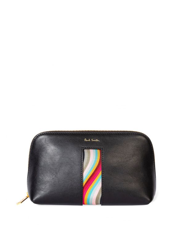 This Paul Smith make-up pouch is an elegant accessory for storing your beauty essentials. Crafted in smooth black leather, this luxe cosmetics bag features a zippered main compartment, swirl grosgrain trim down the centre and a foil-embossed signature to the front. It's complete with iconic tie-shaped zip pulls.