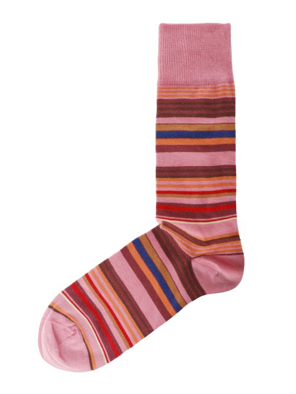The Niam Stripe Socks from Paul Smith bring vivid pattern to everyday wear with Paul Smith’s signature multi-stripe design and a ribbed cuff for a secure fit. Made in Italy and finished with the label’s printed signature on the foot, they are knitted for flexibility and subtle texture. The pair complements both tailored and casual footwear, adding a refined point of interest to outfits. Ideal for those who favour considered detailing, they arrive as a single pair ready to wear.