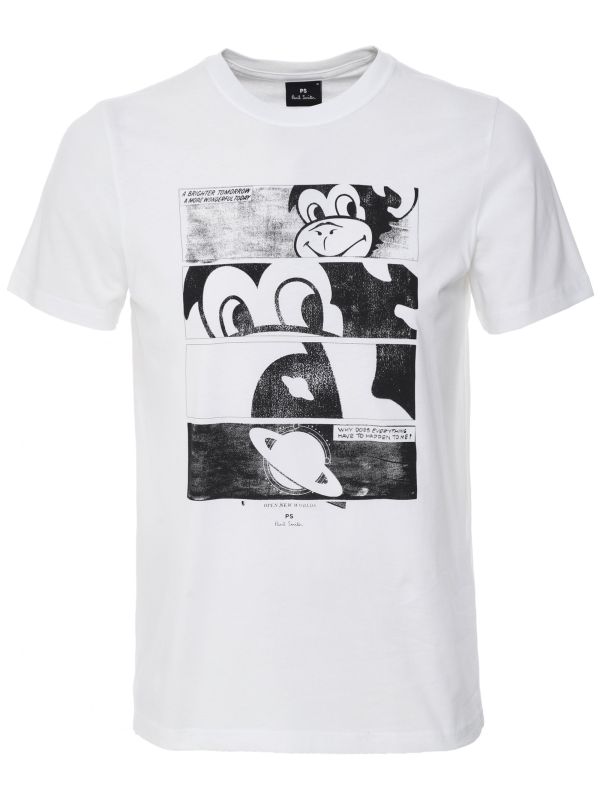The PS by Paul Smith Monkey t shirt showcases the label's penchant for playful design. Engineered in premium organic cotton jersey, the short sleeve tee offers a super soft handle and regular fit. Featuring a traditional ribbed crew neck, whilst the comic strip graphic depicts the label's cheeky mascot.