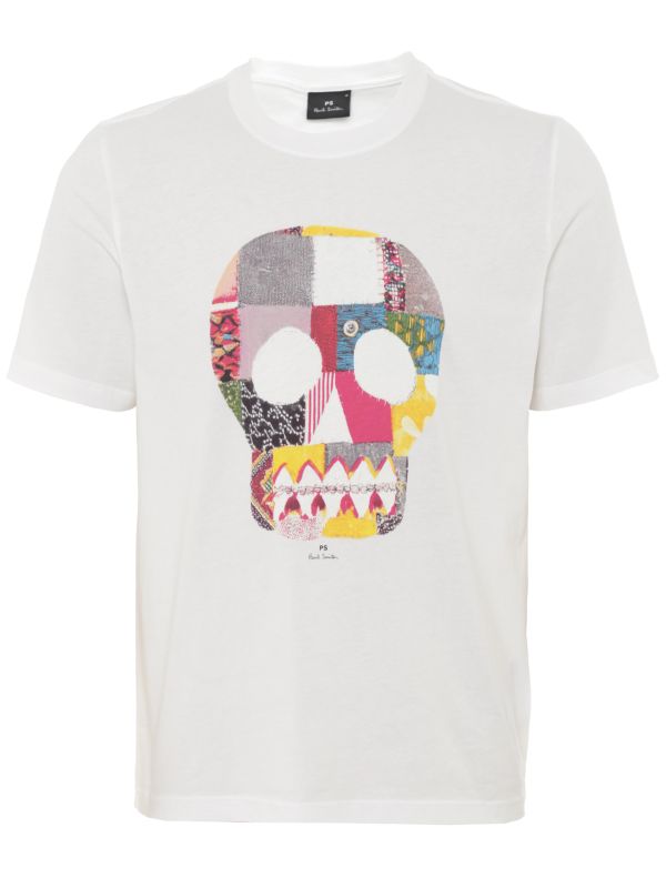 - Large patchwork-style skull print to front