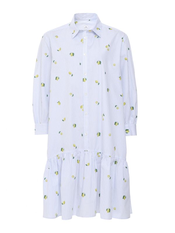 Combine traditional techniques and modern silhouettes with the Paul Smith shirt dress. Responsibly crafted from pure organically grown cotton, the dress offers a classic collar and a button fastening. With a quirky peplum detail to the hem, 3/4 sleeves and a pinstripe and lemon design all over, the dress is perfect for making a statement at your next casual outing.