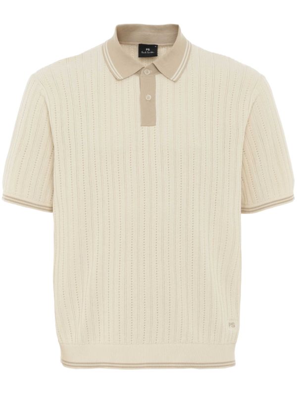 Pointelle Knit Polo Shirt is a knitted short-sleeve polo from Paul Smith, crafted from organic cotton and finished in a pointelle stitch for breathable texture. It features a two-button placket, tipped polo collar and matching cuffs, plus a discreet PS logo at the hem. The openwork knit offers seasonal versatility for smart-casual outfits or layered looks. Wear it with tailored Pants or lightweight shorts for a modern silhouette. Finished with ribbed hem and cuff detailing, this polo combines careful construction with contemporary tailoring for an elevated everyday option.