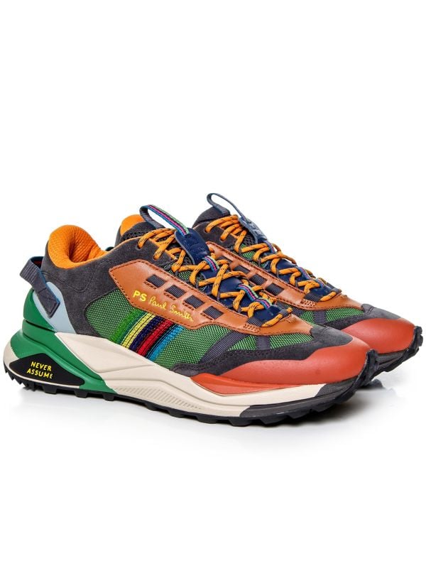 The Paul Smith Primus sneakers draw inspiration from a classic trail-running shoe. Constructed in a mixed panel design, the sneakers showcase a super modern and colourful appearance. Featuring a lace-up fastening with ankle puller tape and 'Sports Stripe' sides for an iconic finish, whilst the chunky rubber outsole assures the most comfortable feel with every step.