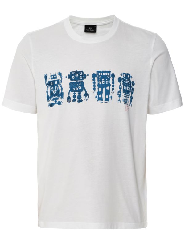 Introduce playful character to casual outfits with the Robots Print T-Shirt by Paul Smith. This t-shirt presents a line of whimsical robot motifs across the chest, realised in a textured graphic with a small PS stamp. Cut to a classic crew-neck silhouette with short sleeves, it sits comfortably for everyday wear and layers easily under jackets. Pair it with denim, chinos or smart tailoring for a contemporary yet relaxed result.
