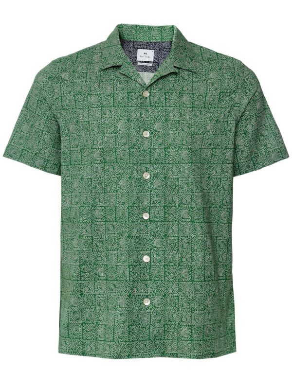 The Paul Smith short sleeve printed shirt embodies casual sophistication with its lightweight and breathable cotton fabric, perfect for warm weather. Featuring a distinctive revere collar and short sleeves, it offers both comfort and style. The shirt's standout feature is its repeat tribal tile print, adding an eye-catching flair to any outfit.