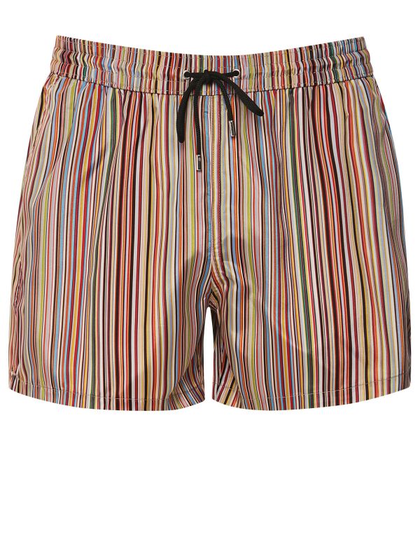 Spruce up your summer essentials with the Paul Smith Signature Stripe swim shorts. Adorned in the label's 'Signature Stripe' pattern throughout, the swim shorts feature a net lining, whilst the slash pockets and a handy zippered seat pocket offer secure storage. The contrast drawstring is complete with branded metal tips, whilst the shorts come complete with a waterproof stow bag.