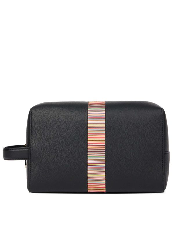 The Paul Smith Signature Stripe trim wash bag is a stylish and practical travel essential. Crafted from grained leather, it features the iconic Signature Stripe trim for a touch of bold, modern flair.