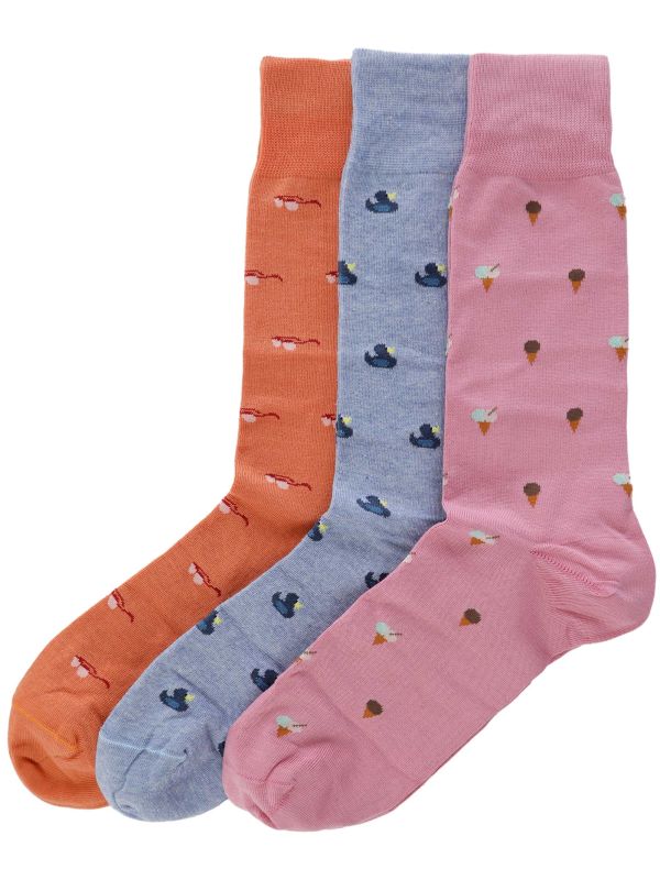 The Summer Novelty Socks 3 Pack offers three playful pairs from Paul Smith. Each pair features a distinctive novelty motif — sunglasses, a rubber duck and an ice cream cone — knitted throughout for a whimsical finish. Designed to sit at mid-calf with ribbed cuffs, the set is presented in the label's striped gift box, making it a considered present. These versatile socks inject personality into everyday footwear and are ideal for gifting or adding a light-hearted touch to tailored and casual looks.