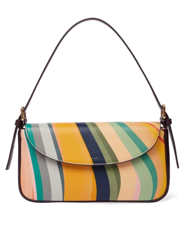 The Swirl Baguette Shoulder Bag is a compact, curved-top design from Paul Smith. The signature Swirl print dresses a structured leather body while a rounded flap fastens with a magnetic snap. An adjustable top handle with buckled detailing sits above neat piping and gold-tone hardware, and the interior offers a zipped pocket for organisation. The subtle embossed logo appears on the flap. The clean silhouette and compact proportions make it an adaptable companion from day to evening.