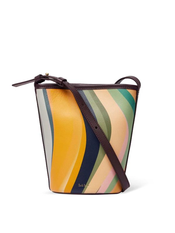 The Swirl Bucket Crossbody Bag is a compact, sculptural silhouette from Paul Smith, rendered in the label's signature Swirl print. Crafted from grained leather with smooth leather trim, it has a round base and an adjustable shoulder strap for hands-free wear. A magnetic snap keeps contents secure while a fabric-lined interior offers enough room for essentials. Finished with a small gold logo stamp and neat topstitching, this crossbody makes a wearable, design-led addition to day-to-day looks.