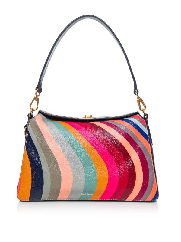 The Paul Smith Swirl shoulder bag is a statement accessory for your everyday rotation, crafted in textured leather with a signature vibrant print. This beautiful bag features a foldover flap, detachable carry handle, navy leather trims and an inside zip pocket. Gold-tone hardware and an embossed gold-foil logo complete the look.