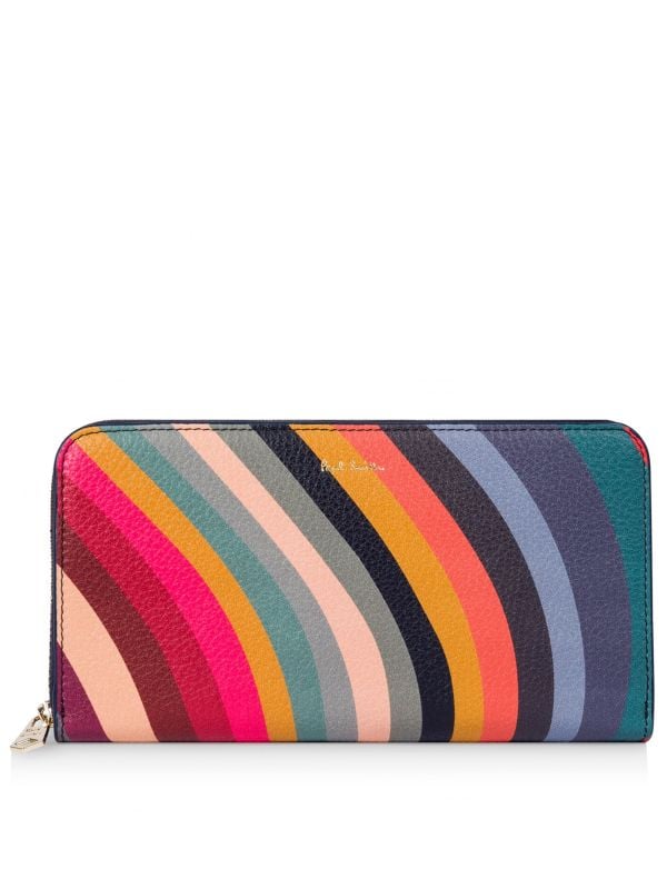 The Paul Smith 'Swirl' print purse is a beautifully crafted accessory with a vibrant aesthetic, made from 100% calf leather and adorned with the brand's iconic 'Swirl' print for a bold look. This zip-around purse opens to reveal a bright red leather interior and offers ample room for the essentials with two slip pockets, twelve card slots and a centre zip compartment for coins. Complete with gold-tone hardware and a gold foil Paul Smith signature detail to the front, this authentic design-led accessory is a must for your handbag.