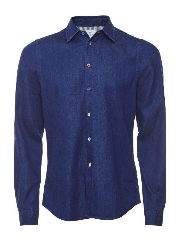 Lend a smart touch to your summer attire with the Paul Smith denim shirt. Crafted in organic cotton denim, the shirt has been cut to a tailored fit for a contoured silhouette. Featuring a pointed with buttoned cuffs, whilst the multi-coloured shell buttons lend signature PS detail.