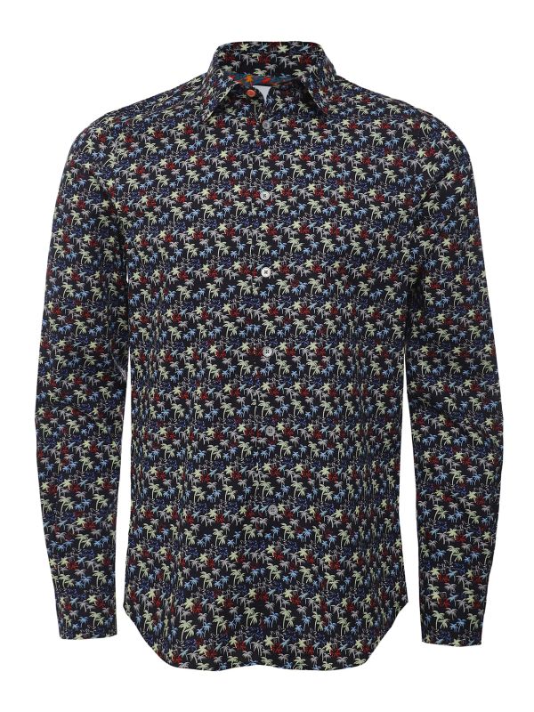 The Paul Smith palm print shirt epitomises a harmonious blend of style and sustainability, crafted from organic cotton to promote environmental consciousness. Its design features a pointed collar and a refined French placket, embodying sophistication with attention to detail. The distinctive pink collar button adds a touch of playfulness to the ensemble, while the long sleeves and buttoned cuffs ensure a versatile appeal.