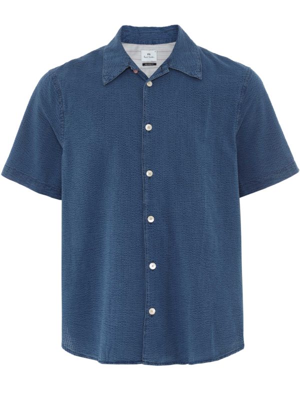 The Paul Smith Textured Relaxed Shirt is a short-sleeve, relaxed-fit shirt cut from puckered, textured cotton. It has a camp collar and a button-through front for easy styling, with a contrasting top button adding a subtle point of interest. Tailored with a gentle drape, it fastens with round buttons and has neat hem finishes for clean lines. Ideal layered over a T-shirt or worn alone, it offers breathable comfort and laid-back structure for warm-weather wear.
