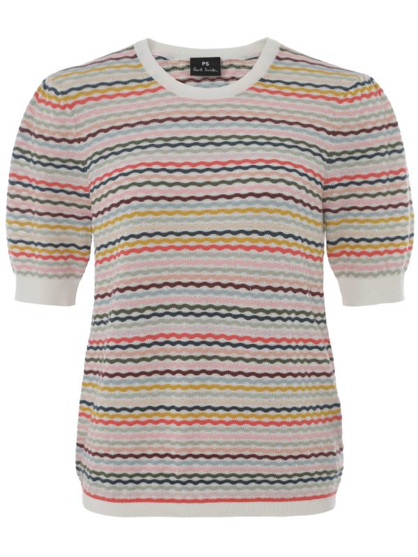 The Wavy Stripe Short-Sleeve Top is a lightweight knit from Paul Smith. Crafted in 100% cotton, it features a crew neckline, short sleeves and ribbed trims at the cuffs and hem. A textured wavy stripe stitch runs across the body for subtle depth and tactile interest, while the pull-on construction keeps the silhouette clean and comfortable. Finished with neat ribbed edges, it offers breathable comfort for seasonal wear. Pair with tailored Pants or a midi skirt, or layer under a jacket for versatile daytime styling.