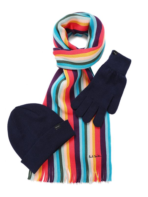 Gift a loved one a premium present this season with the Paul Smith winter gift set. Comprising of a warming beanie hat and gloves in matching hue, the set is complete with a vibrant tasseled scarf adorned in the label's famous striped pattern for a bold and iconic aesthetic.