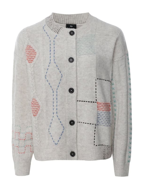 The Paul Smith Patchwork Cardigan is a soft and stylish cream knitted cardigan made from a wool-blend. This Paul Smith cardigan showcases a classic cable-knit design, elevated by embroidered patchwork detailing with small pops of colour. It buttons at the front and is the perfect layer for curating outfits in cooler temperatures.