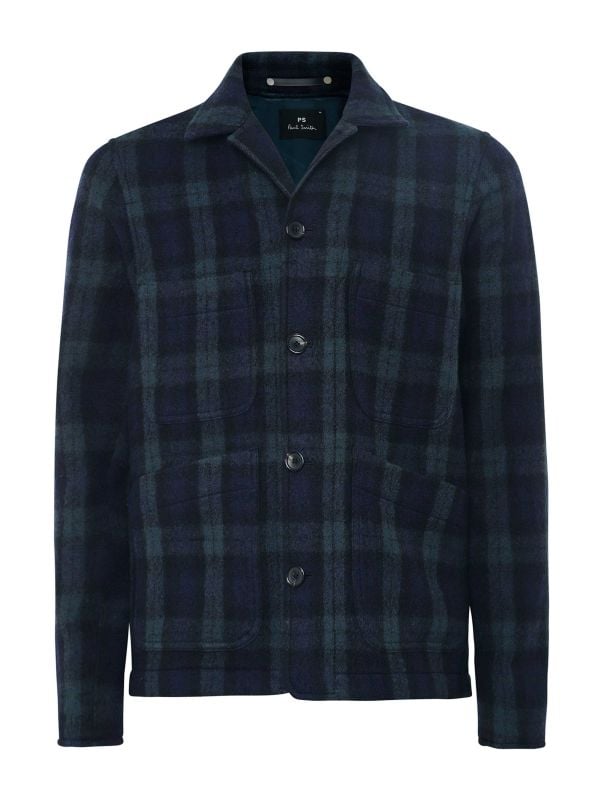 The Paul Smith chore jacket is a stylish take on classic workwear. Crafted from soft wool, it offers warmth and a structured feel, while the subtle check pattern adds visual interest. Designed with a shirt collar and button closure, it features four patch pockets for practicality and long sleeves with buttoned cuffs for a clean finish. Cut to a regular fit, this Paul Smith jacket is perfect for layering over casual or smart-casual outfits with effortless style.