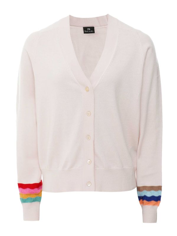 Crafted from 100% wool, this V neck cardigan from Paul Smith is a basic knit transformed by multicoloured details to the sleeves, offering a slightly different take on the brand's signature 'Swirl' design. Complete with a V neck, button closure and subtle ribbed detailing to the neckline, waistband and cuffs, this cardigan is an ideal way to bring colour to your everyday ensembles.