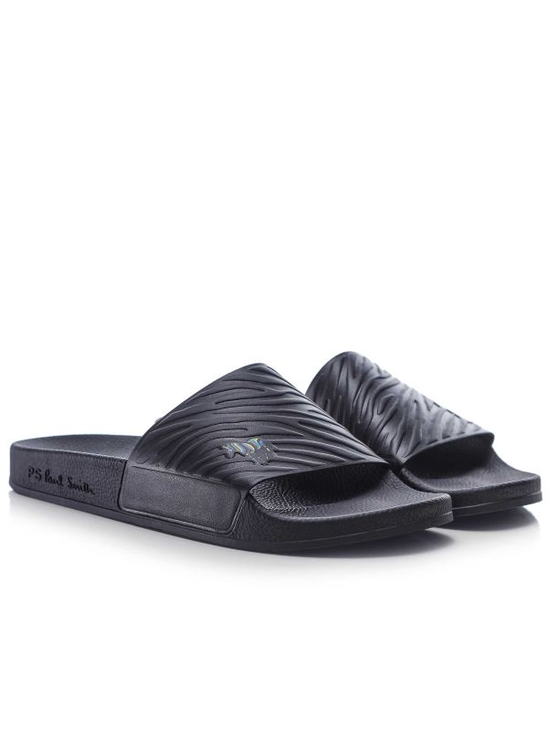 The Paul Smith Zed Zebra Slides marry contemporary motifs with easywear comfort. This pair presents a single wide strap embossed with a zebra-like texture and a small multicolour zebra motif. A contoured, textured footbed and slip-on construction deliver casual support while the moulded sole shows the PS Paul Smith signature on the tread. Ideal for poolside or relaxed days, these slides combine playful detailing with practical construction for everyday ease. Comfort-focused design and hardwearing construction make them a reliable seasonal choice.
