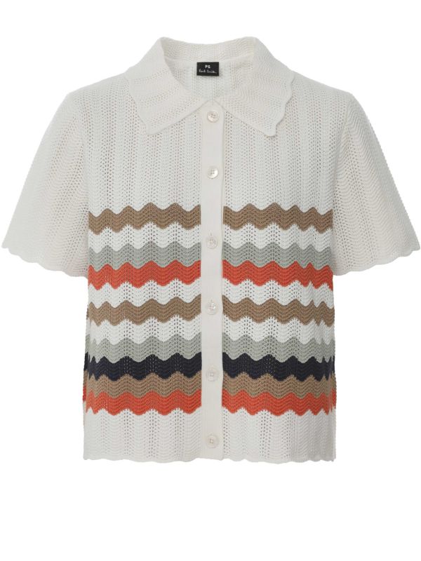 Designed by Paul Smith, the Zig Zag Stripe Knitted Top is a short-sleeve, button-front knit in 100% cotton. It features an openwork stitch with wavy stripe detailing across the body, a pointed scalloped collar and scalloped edges at the sleeves and hem. The button-front fastening and relaxed silhouette make layering effortless, while the textured trims add subtle interest. Wear it over a tee or a lightweight dress for considered daytime outfits that work from weekend errands to casual office days.
