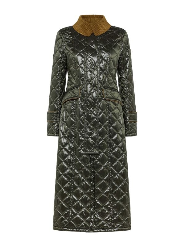 The Roderik Long Quilted Coat is a longline, diamond-quilted coat from Peuterey. It features a corduroy point collar and a popper-front fastening for a neat finish. Tailored seams define the waist while flap pockets with piped trim add practical detail. Adjustable cuff straps and a subtle brand badge to the sleeve complete the design. The glossy outer gives a polished appearance while the full-length cut provides added coverage. Ideal for cooler days, it pairs easily with layered knits and ankle boots.