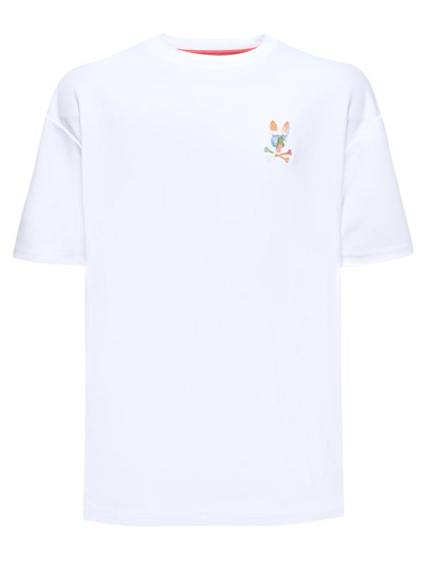 Made for relaxed, everyday wear, the Ara Relaxed Fit Tee by Psycho Bunny combines a roomy silhouette with considered detailing. It has a crew neckline, short sleeves and a dropped shoulder that creates a casual, easy profile. A small, multicoloured embroidered bunny-and-crossbones motif at the left chest adds discreet designer character. The ribbed neckline and neat hem provide clean structure, while the relaxed shaping layers under jackets or pairs with sweatpants for a low-key finish.
