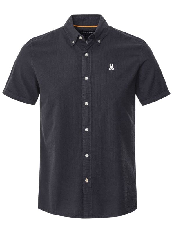 The Psycho Bunny Alton shirt is a lightweight must-have for fresh summer style. Crafted in pure cotton seersucker, the shirt offers breathability and a tactile handle. Featuring a button down collar and short sleeves, whilst the label's iconic logo is embroidered at the chest.