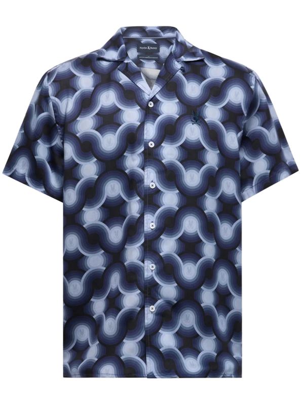 The revere collar and short sleeves give it a laid-back, vacation-ready vibe, while the geometric pattern adds a modern edge. Finished with an embroidered logo and button-down front, it strikes the right balance between smart and relaxed. Designed in a regular fit, the Psycho Bunny shirt pairs effortlessly with shorts or chinos for standout summer styling.