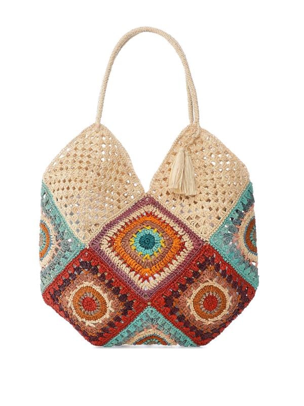 The Rabarany Adele crochet bag is the perfect summer accessory. Crafted from 100% raffia and handmade in Madagascar, the Adele bag features two top handles with tassels to the front, a concealed press button closure, an internal pocket and vibrant patterns offering a statement look. Lightweight yet roomy enough to carry shopping or beach essentials.
