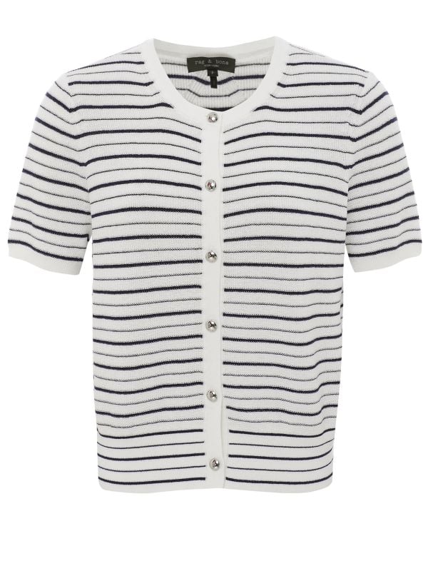 The perfect summer knit, discover the Dina Cardigan by Rag & Bone. Crafted from lightweight cotton yarn with horizontal stripes and cut with short sleeves, this Rag & Bone cardigan is a comfy layer for warmer days. It's designed to be fitted and cropped and features dome-shaped metal buttons with branding and a V-stitch seam detail on the back for a finishing touch.