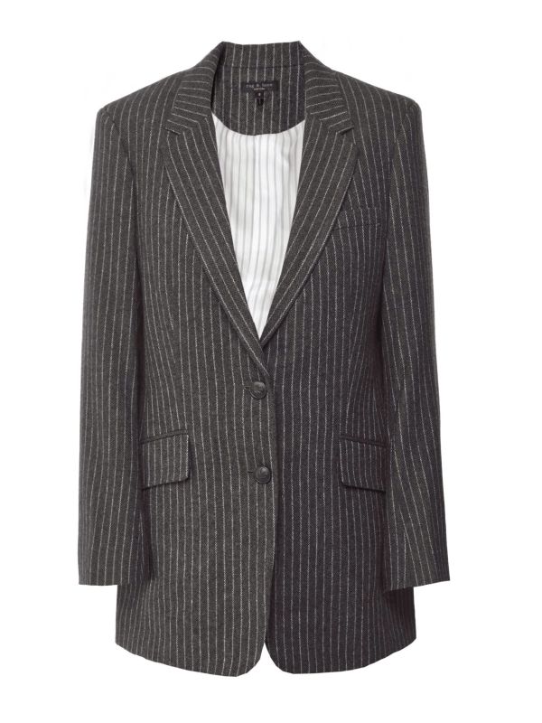 The Rag and Bone Charles blazer is tailored to perfection for a slightly oversized fit. Crafted from heritage Italian wool, the V-neck striped blazer has the brand's signature metal dagger buttons with leather backs, a contrasting red felt undercollar, a welt chest pocket and two hip pockets with flaps.