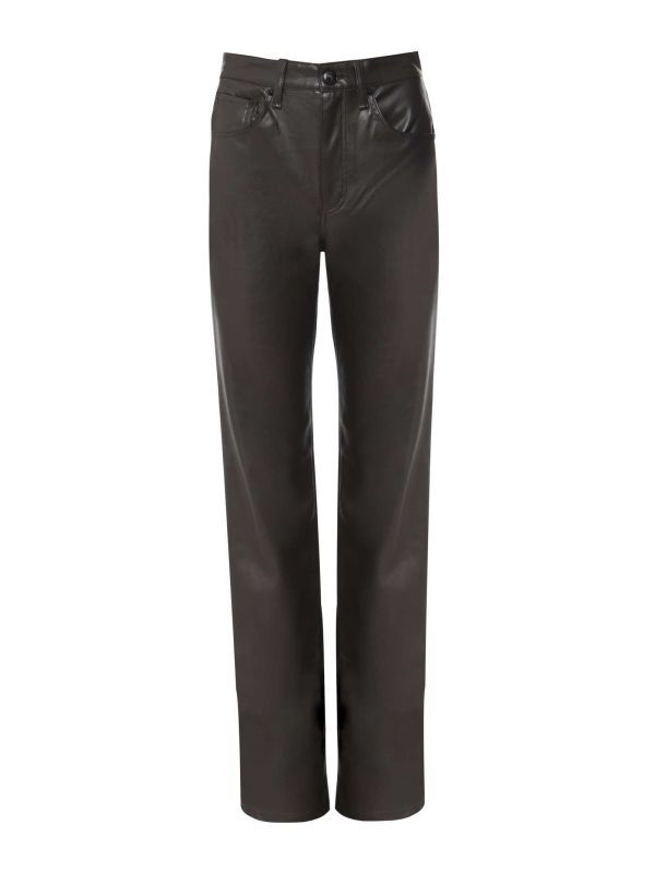 Introducing the Harlow Faux Leather Trousers by Rag & Bone, a cool new style for your seasonal wardrobe. Featuring a mid-rise waist and a full-length straight leg, these Rag & Bone trousers are crafted from a smooth faux leather fabric offering a clean, sleek look. Complete with a concealed zip closure, central metal tack button, five pockets and an embroidered monogram to the back pocket.
