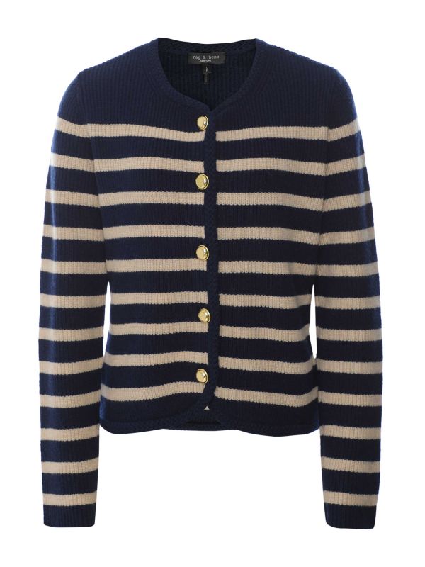 The Rag & Bone Nancy cardigan is a timeless knit featuring a striped pattern throughout. It's made from an extra fine merino wool blend and features a round neck, button closure with branded buttons, long sleeves and a relaxed fit. Wear yours throughout the seasons as this Rag & Bone cardigan offers a versatile layering piece.