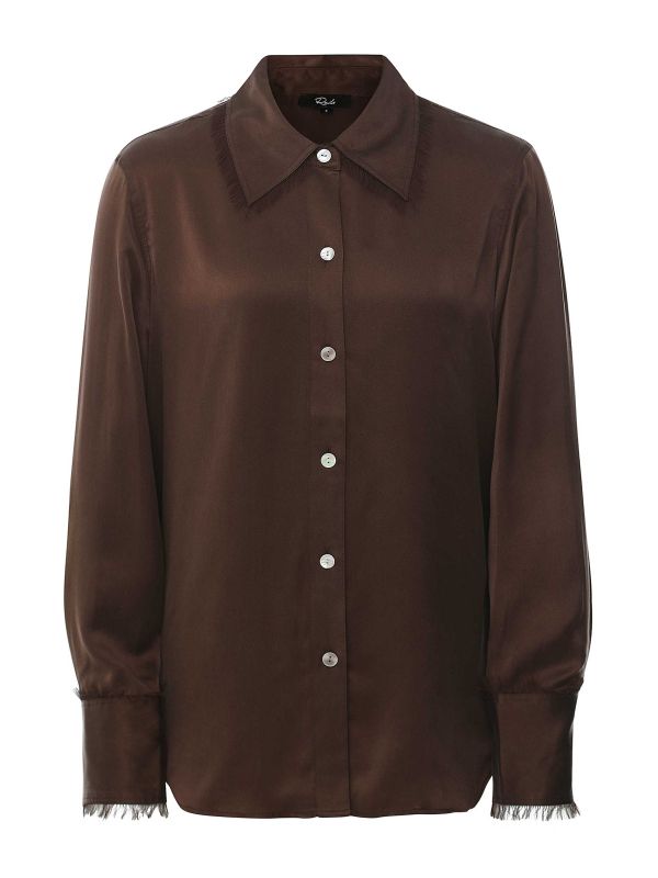 The Rails Abbey Frayed Shirt is cut from 100% silk and features a clean button-through front. A point collar with delicate frayed trim and matching frayed cuffs add subtle texture to the otherwise pared-back design. The long sleeves and gently curved hem create a neat silhouette that layers well over denim or tailored trousers. Wear it tucked or untucked for versatile styling that moves easily from daytime to evening.
