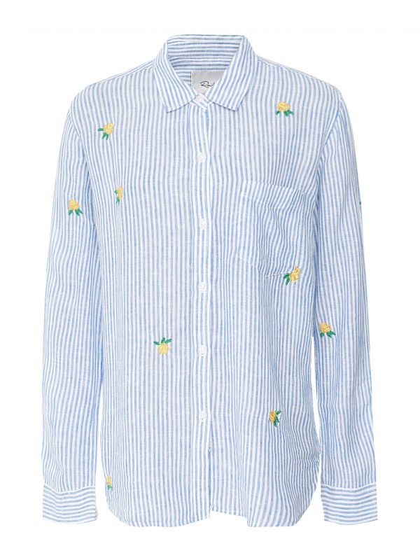 Introduce casual, California-inspired style into your wardrobe with the Rails Charli embroidered rose shirt. Crafted in a luxurious linen and rayon blend, this lightweight shirt features a pointed collar, button-down fastening, button cuffs and a high-low shirttail hem, with an all-over stripe print and delicate embroidered rose details for a chic finishing touch. Wear with your favourite denim for an effortless laid-back look.