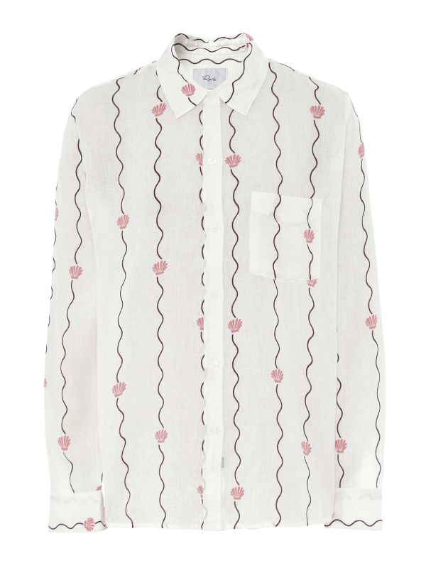 The Rails Charli Linen Shirt is a relaxed button-down crafted in a breathable linen blend. Cut with a point collar, long sleeves and a chest patch pocket, it falls to a softly curved hem for easy layering. The design is detailed with vertical wavy stripes and small shell motifs for a playful, coastal feel. Fastening with a neat button front, it works equally well tucked into tailored Pants or worn loose over shorts for laid-back daytime dressing. Pair with sandals or loafers for easy weekend looks.