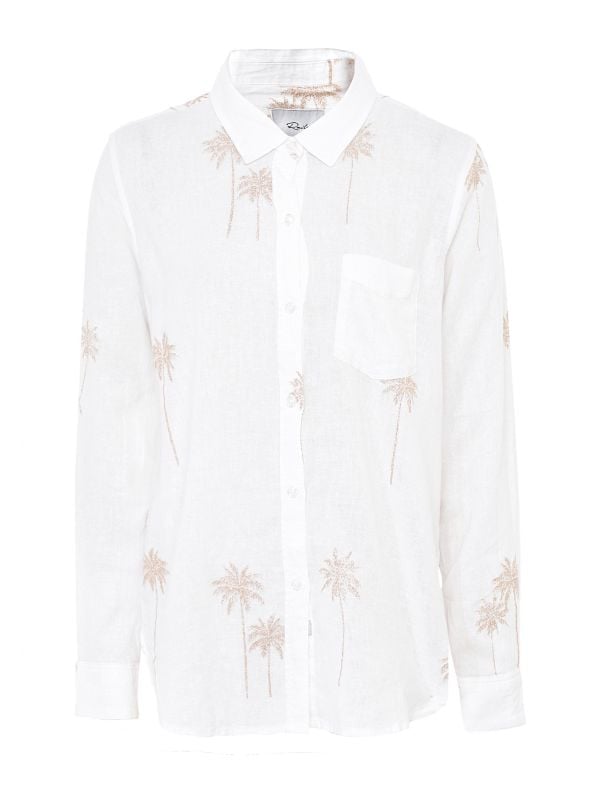 Get a laid-back spring/summer look with the Rails Charli palm trees shirt. Crafted from a lightweight linen blend, this effortless everyday shirt features a button down fastening, pointed collar, single chest pocket and long sleeves with buttoned cuffs. The shirt is complete with a glitter rose gold palm tree print and a contemporary curved hem.