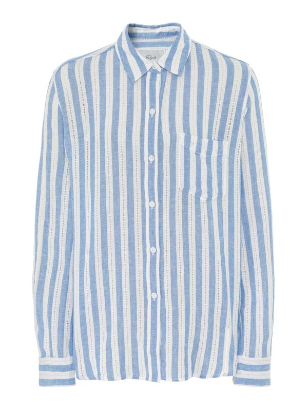 The Rails Charli Striped Shirt is a relaxed button-up cut from a lightweight linen blend with openwork stripe detailing. It features a classic collar, chest patch pocket and button-through fastening, plus long sleeves and a gently curved hem for easy layering. The breathable, airy fabric and straight silhouette make it ideal for warm-weather dressing; wear it loosely tucked into Pants or layered over a camisole for casual weekend looks.