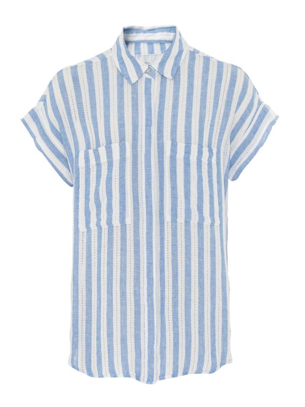 The Rails Cito Stripe Shirt is a lightweight shirt cut from a linen-rayon blend with openwork ladder details. The relaxed silhouette sits with a classic collar, button-through front and short rolled sleeves, while two oversized patch pockets add casual utility. A gently curved hem finishes the shape for easy layering. The fabric offers breathable comfort in warm weather and the subtle openwork brings texture. Pair with tailored Pants or relaxed denim for versatile day-to-night styling.