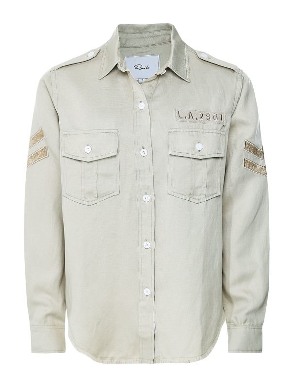 Get a cool, casual look this season with the Rails Conrad shirt. This pistachio vintage style military shirt is sustainably crafted in a luxe tencel and linen blend and features a button-down fastening, two chest pockets, long sleeves with buttoned cuffs and military patch details over the pocket and at both sleeves. Wear yours with skinny jeans and sneakers on laid-back days.