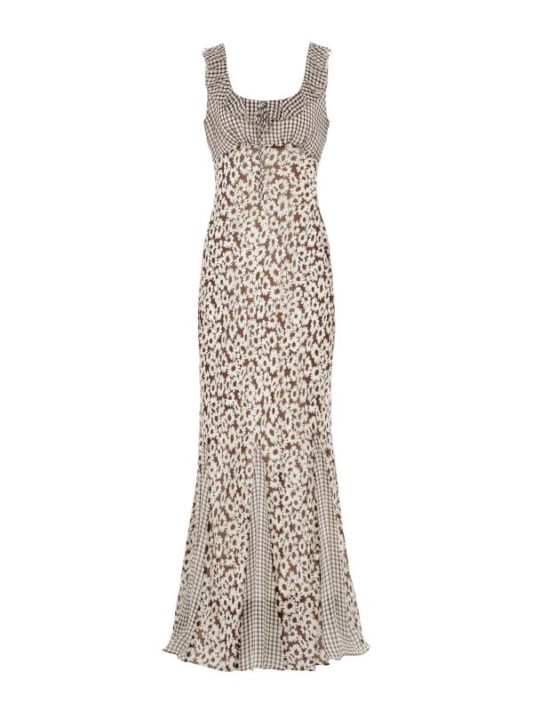 Rails presents the Dahlia Gingham Maxi Dress, a floor-length silhouette that blends floral and gingham panels to create subtle contrast and movement. The dress features a scooped neckline with ruffle trim, a tie-detail at the bust and sleeveless straps, fitted through the torso before opening into flared skirt panels. Cut on the bias for a fluid drape, it is crafted from Rayon with a polyester lining for comfortable wear. Style with strappy heels for evening or sandals for relaxed daytime looks.