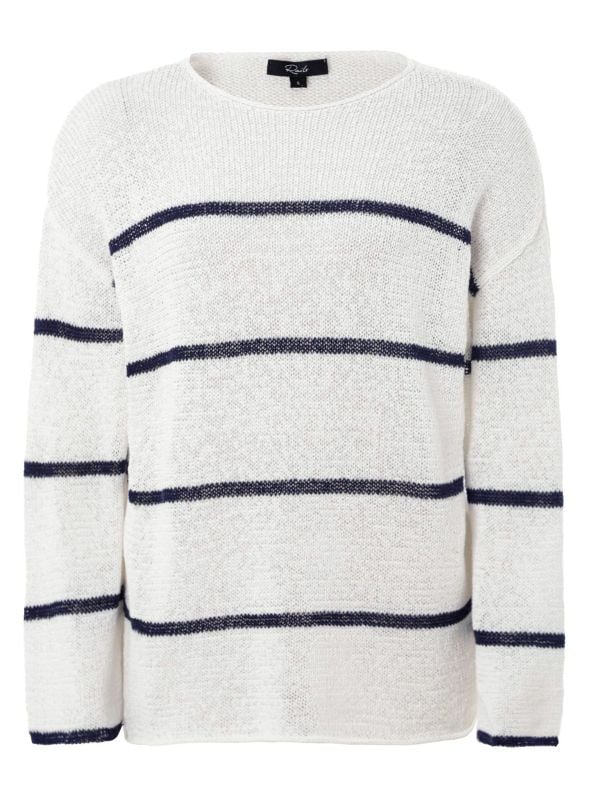 The Rails Evangeline Jumper is the perfect lightweight knit, ideal for layering or wearing solo. Crafted from a cotton-linen blend, this Rails jumper has a relaxed fit and features navy horizontal stripes. It has a boat neckline and long sleeves, ideal for staying comfortable while looking stylish.
