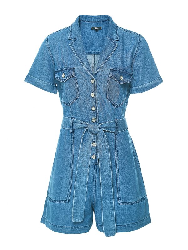 Crafted in structured denim, this short sleeve utility romper is a versatile staple for your summer wardrobe. Featuring a relaxed fit, button-down front, lapel collar, flap pockets at the chest, side pockets at the hip and a self-tie waist belt, this effortlessly elegant piece looks great styled simply with sandals or sneakers.